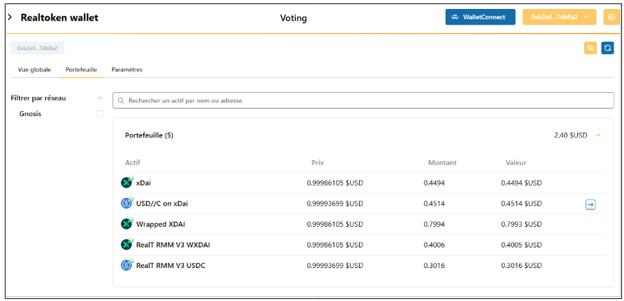 Le *Realtoken Wallet* n'est disponible que sur Gnosis : N'envoyez pas de fonds à son adresse, sur une autre blockchain, ils seraient perdus !