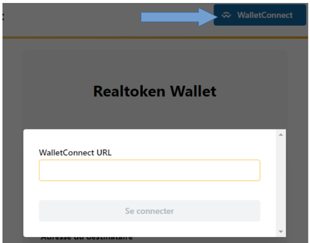 * Sur une des instances vous lancer la [DApp *RealToken Wallet*](https://wallet.realtoken.network/)*,* vous vous connectez avec votre Social Login et vous cliqué en haut sur WalletConnect : une fenêtre va apparaitre où vous devez entrer une URL WalletConnect...