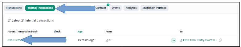 * Sélectionnez "Internal Transactions" , puis cliquer sur la dernière transaction&#x20;