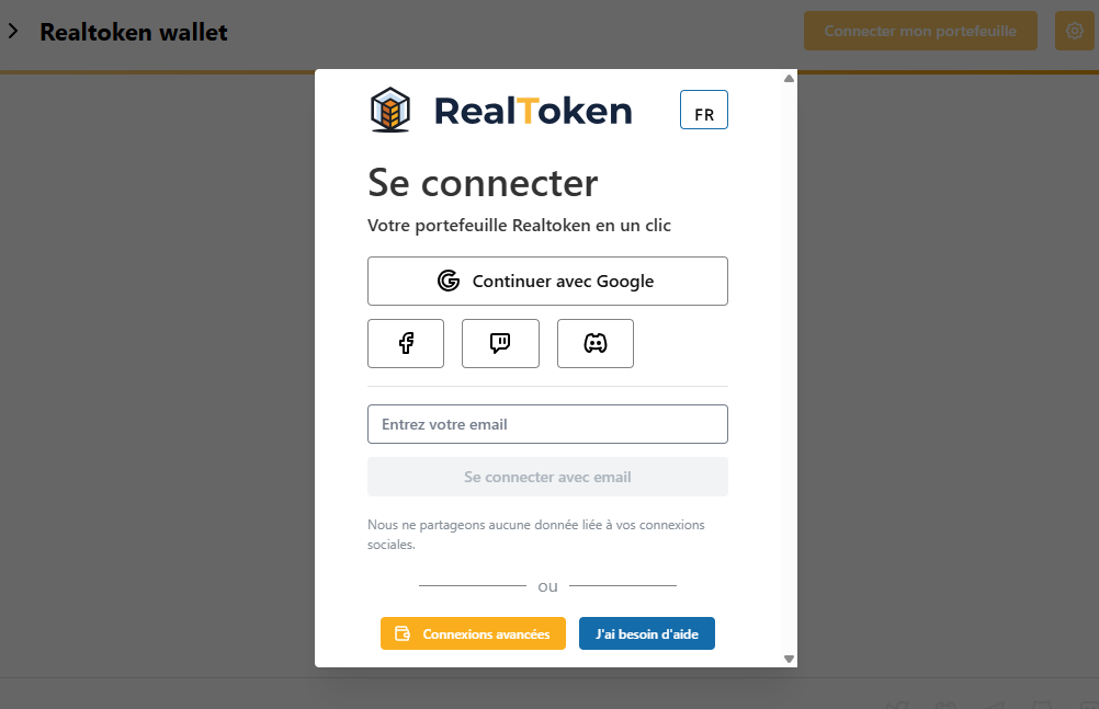 Pour vous connecter, à l'application *Realtoken wallet,* vous devez utiliser le social login (Compte : Google, Facebook, Twitch ou Discord) que vous avez indiqué lors de la création de votre *Realtoken wallet*.&#x20;