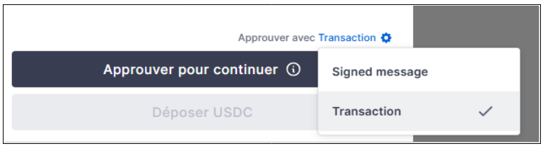 Lorsque vous déposer pour la première fois des USDC sur RMM, veiller a être en mode Transaction et non Message signé :&#x20;