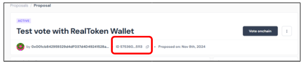 * sur l'application de [vote DAO](https://www.tally.xyz/gov/realtoken-ecosystem-governance), de copier le Proposal ID du vote :&#x20;