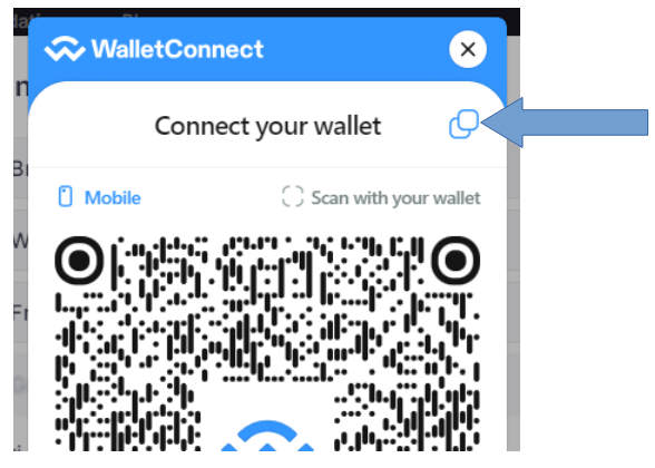* Sur la deuxième instance de navigateur, vous lancer [RMM](https://rmm.realtoken.network/markets/) (par ex), vous connectez votre portefeuille en choisissant WalletConnect : apparait alors une fenêtre avec un QRcode, vous copier le lien associé (dans votre presse papier) en cliquant sur "Connect Your Wallet"